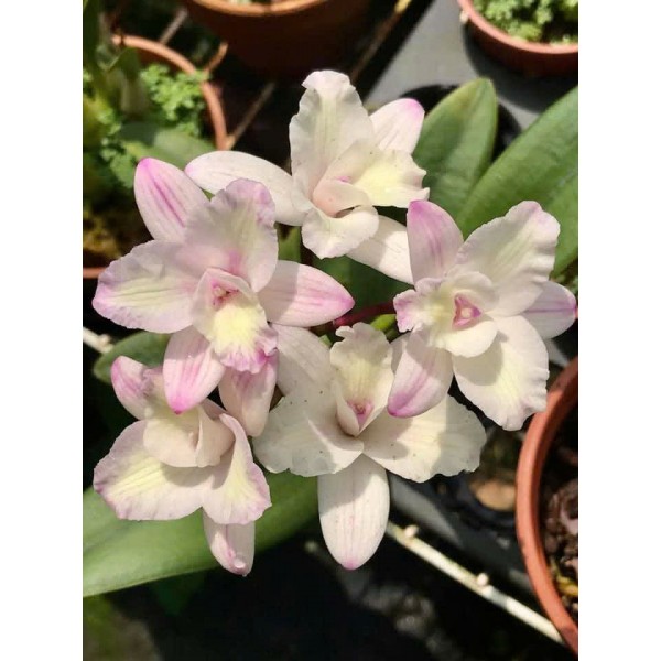 Giống lan lai mang sắc trắng hồng dịu dàng, họng vàng nhẹ tinh tế, hoa xinh và dễ trồng.