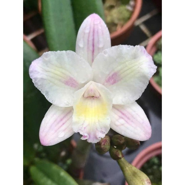C. Cosmos x L. endsfeldzii là dòng lan lai giữa Cattleya và Laelia, nổi bật với vẻ đẹp thanh thoát và nhẹ nhàng. Hoa có nền trắng ngà pha ánh hồng nhẹ, điểm sọc tím hồng tinh tế trên cánh, kết hợp họng vàng dịu tạo nên tổng thể hài hòa và rất cuốn hút.