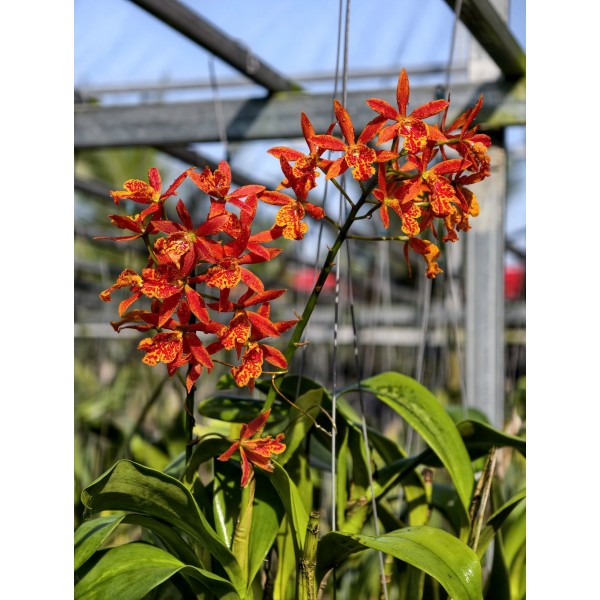 Volcano Trick là dòng lan lai nổi tiếng thuộc nhóm Mokara/Aranda, được ưa chuộng trên thế giới nhờ màu sắc rực rỡ và khả năng cho hoa liên tục. Hoa có tông đỏ cam như “núi lửa” kết hợp đốm vàng nổi bật, cánh hoa thon dài tạo cảm giác mạnh mẽ và khác biệt.